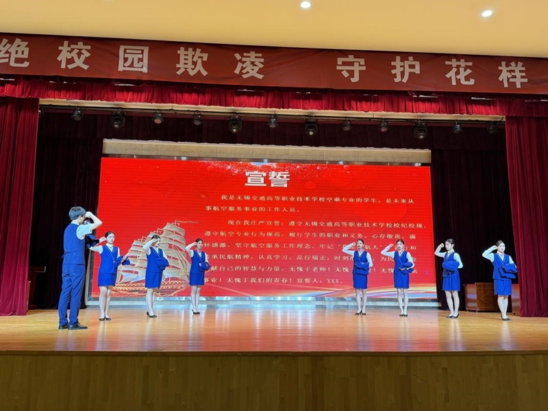 随后,优秀学生代表从船舶工程学院党总支书记赵斌和副院长刘方手中接过代表民航人风采的制服。从这一刻起,23级全体空中乘务、航空服务专业的同学正式成为了准民航人。授装完成后,全体23级新同学们整装肃立,在学生代表童高原的带领下,手握拳头庄严宣誓,将践行和传承民航精神,认真学习,品行端正,时刻准备着为民航事业贡献自己的智慧与力量,无愧于老师、学校、民航事业!无愧于青春!