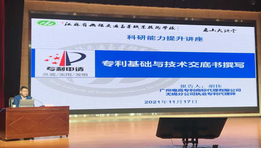 为促进学校科研发展,营造良好的学术氛围,提升学校教师的科研能力、技术服务能力,促进高水平教科研成果产出,11月17日下午,学校邀请《江苏高职教育》期刊社社长杨雨慧、广州粤高专利商标代理有限公司无锡分公司执业专利代理师胡伟作专题讲座。耿兴华副校长出席讲座。讲座由学校科技与合作处处长尹爱华主持。