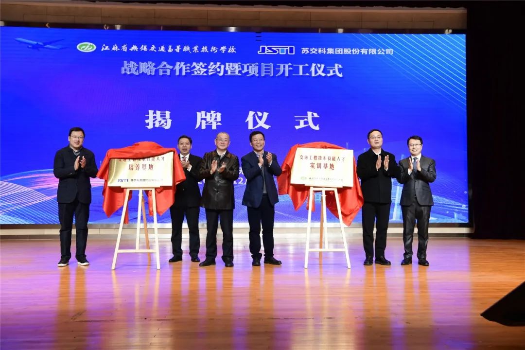 金凌副厅长、夏成满书记、朱晓宁总裁、李虎书记、俞刚局长、惠恭健副局长共同见证战略合作协议的签订,共同为“苏交科集团交通工程技术技能人才培养基地”和“华体会网页版页面登录技术技能人才实训基地”揭牌,并启动生产性交通工程试验检测中心项目开工仪式。