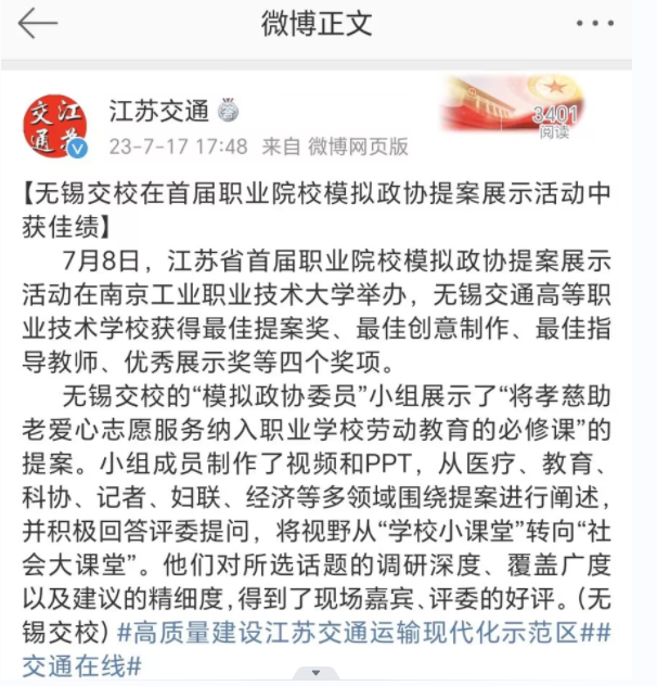 江苏交通:无锡交校在首届职业院校模拟政协提案展示活动中获佳绩