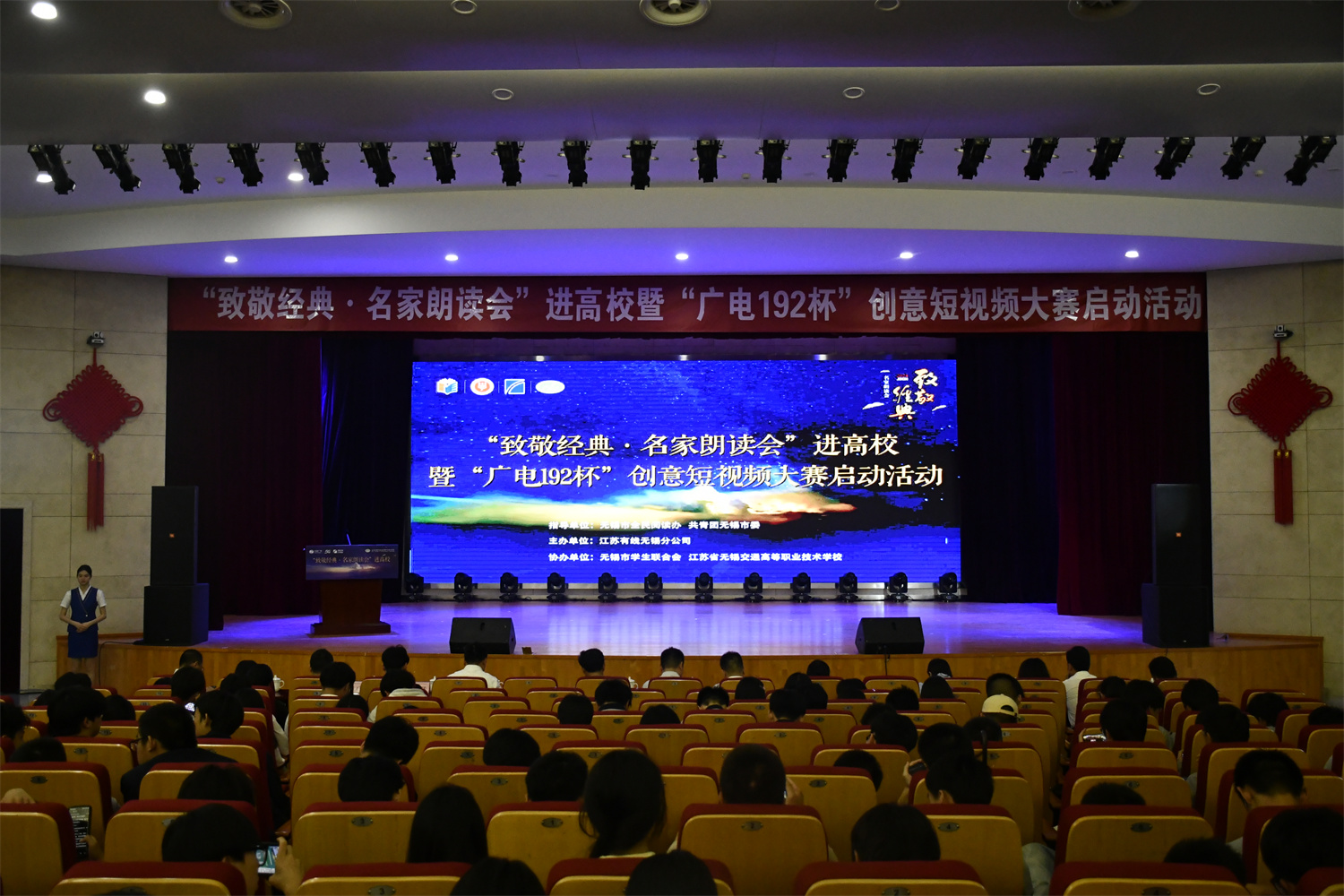 6月5日下午,一场别开生面的文化盛宴在学校大礼堂拉开帷幕。由江苏有线无锡分公司主办,无锡市学生联合会、华体会网页版页面登录联合承办的“致敬经典·名家朗读会”进高校暨“广电192杯”创意短视频大赛启动活动在此成功举办。无锡市委宣传部出版印刷发行处副处长冯健,共青团无锡市委学少部副部长王裔,江苏有线无锡分公司党委委员、副总经理赵晓光,校党委委员、副校长耿兴华、王珏及在锡高校领导代表、江苏有线无锡分公司代表、我校师生代表600余人共同参加了本次活动。