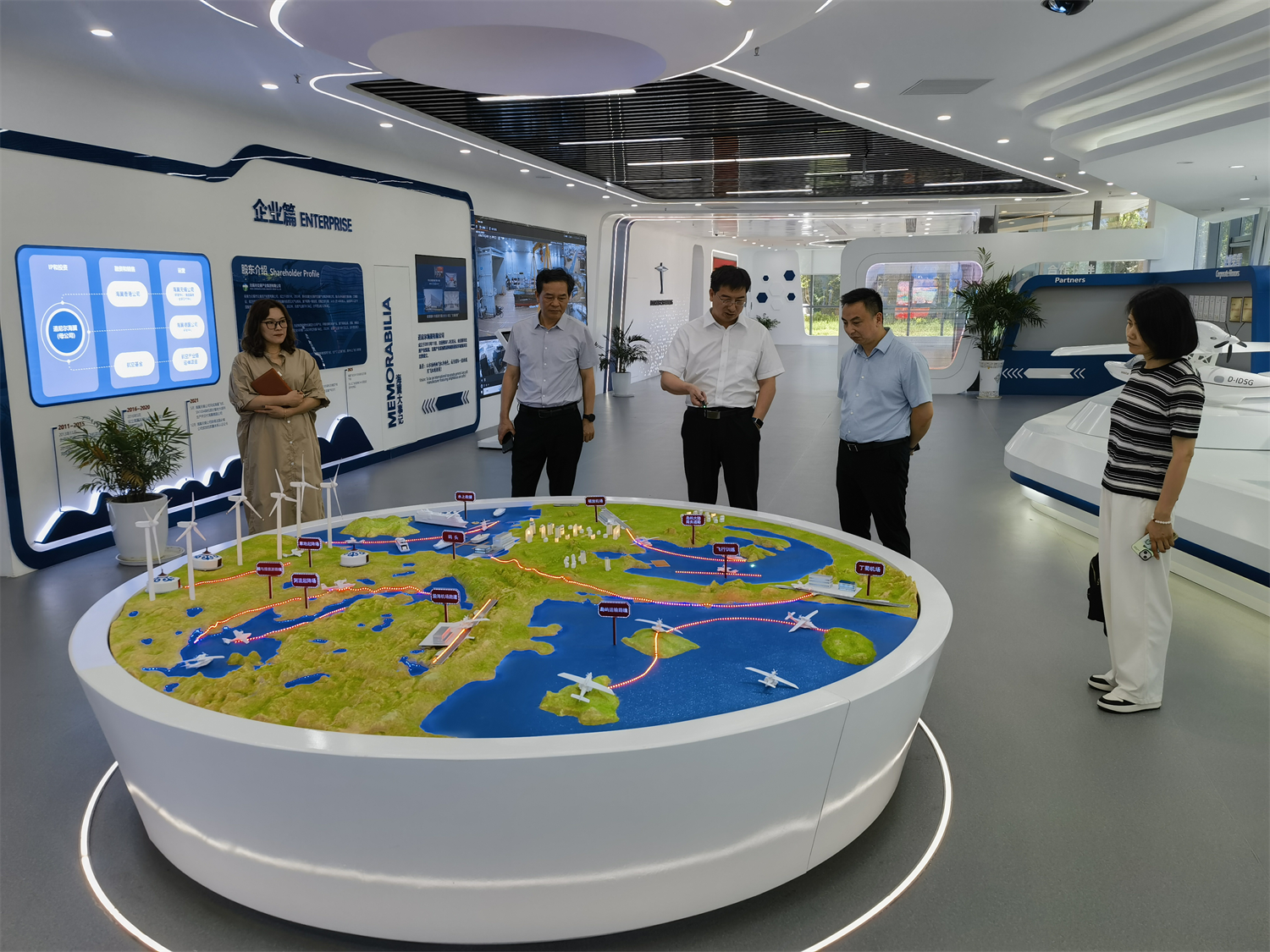 在道尼尔海翼无锡有限公司,崔益华总经理陪同李进一行参观了公司陈列馆以及公司在研机型海星样机,实地走访了总装车间,了解飞机复材部件、航电线束等生产安装情况,听取了道尼尔海翼的企业发展运行情况以及海星项目的进展情况。