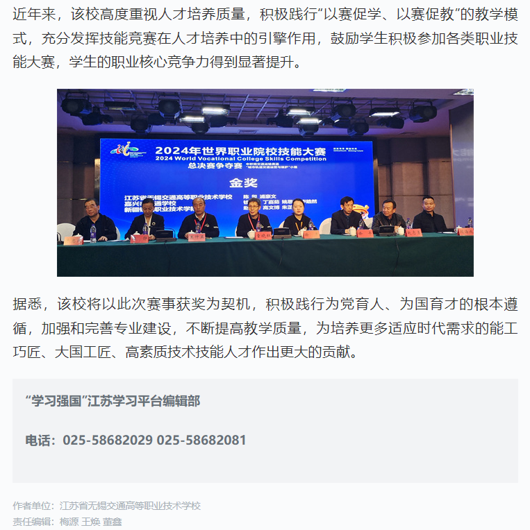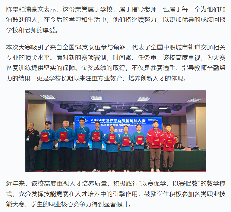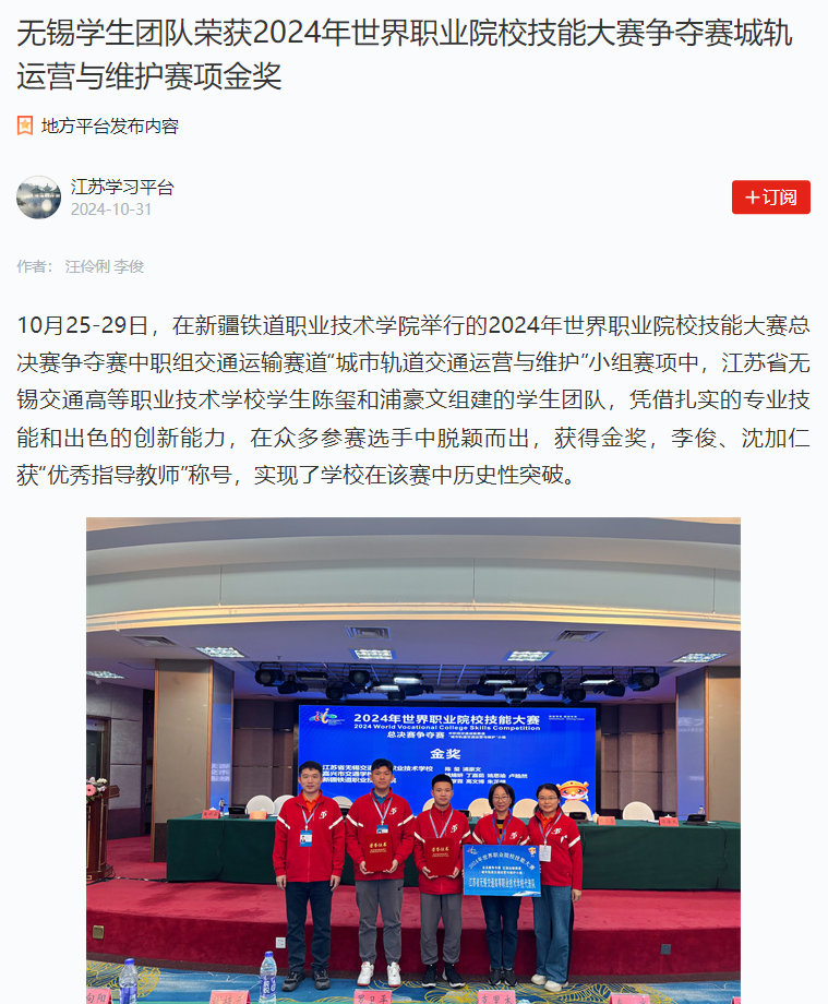 学习强国江苏学习平台:无锡学生团队荣获2024年世界职业院校技能大赛争夺赛城轨运营与维护赛项金奖