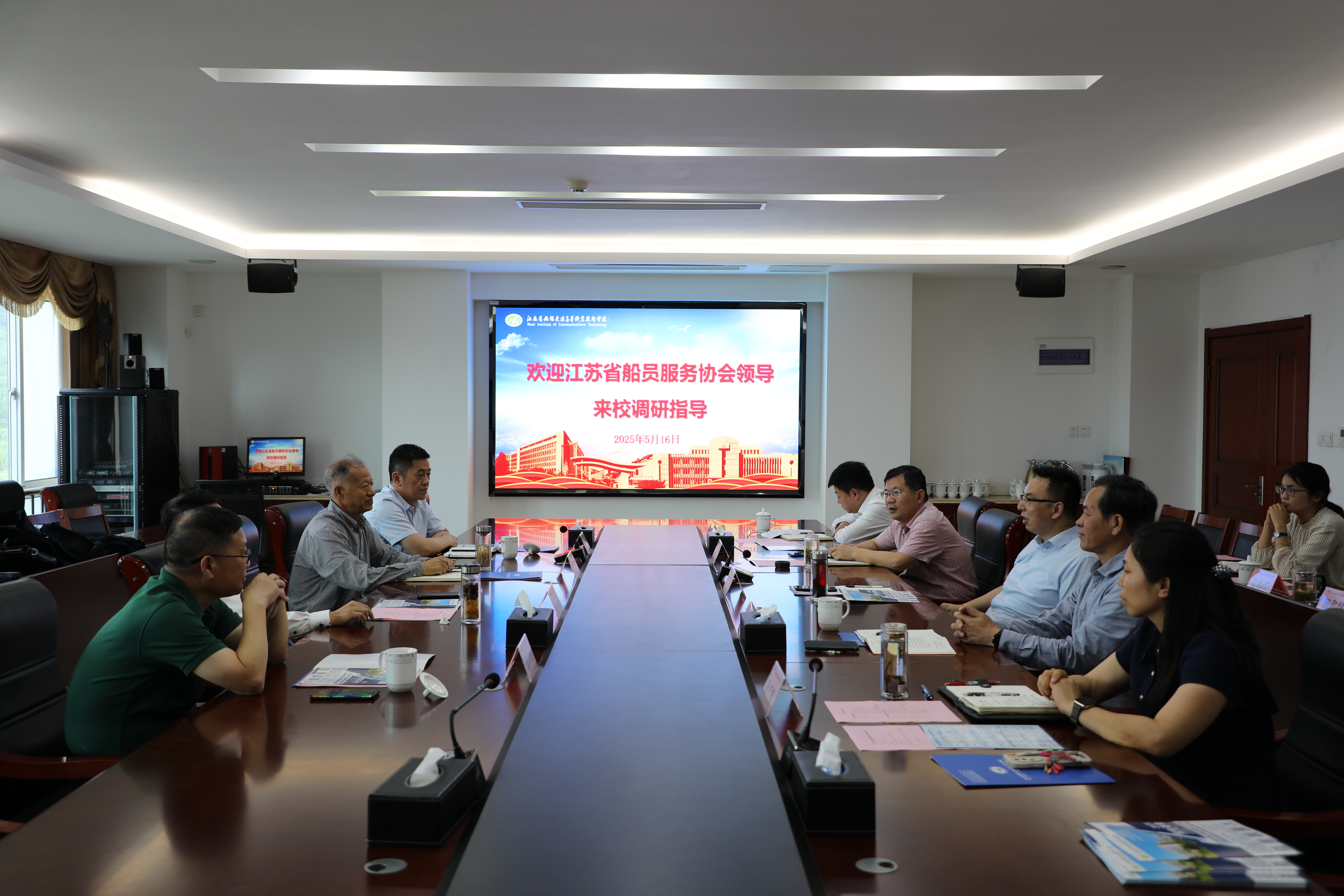 5月16日,江苏省船员服务协会会长、江苏海事职业技术学院党委书记万健一行来校调研。学校党委书记、校长李进出席并主持会议。全体校领导、相关职能部门和学院负责人参加会议。