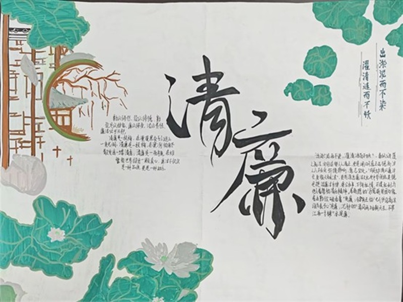 学院面向全体学生发起了“清风廉韵”主题手抄报创作活动,吸引了百余名学生积极参与。同学们以廉洁诗词、历史典故、廉政格言为素材,通过创意设计和艺术表达,将“清正、廉洁、自律”的理念融入一幅幅生动的手抄报作品中。
