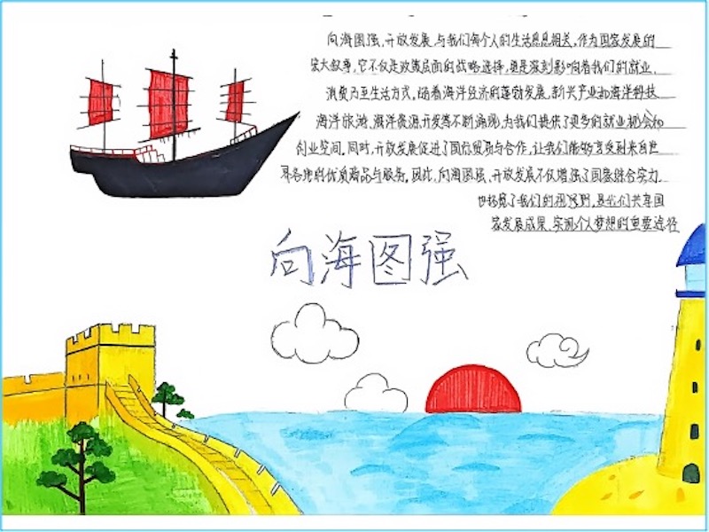 同学们踊跃参与,围绕主题创作了丰富多样的作品。有的通过摄影与文章,展现我国海洋经济的蓬勃发展;有的以手绘和文字,诠释“向海图强”与个人发展的紧密联系;还有同学从海洋科技、资源开发等角度,强调海洋强国战略的时代意义。多幅作品体现了青年一代以专业为桨、以青春为帆,投身国家海洋事业的坚定决心。