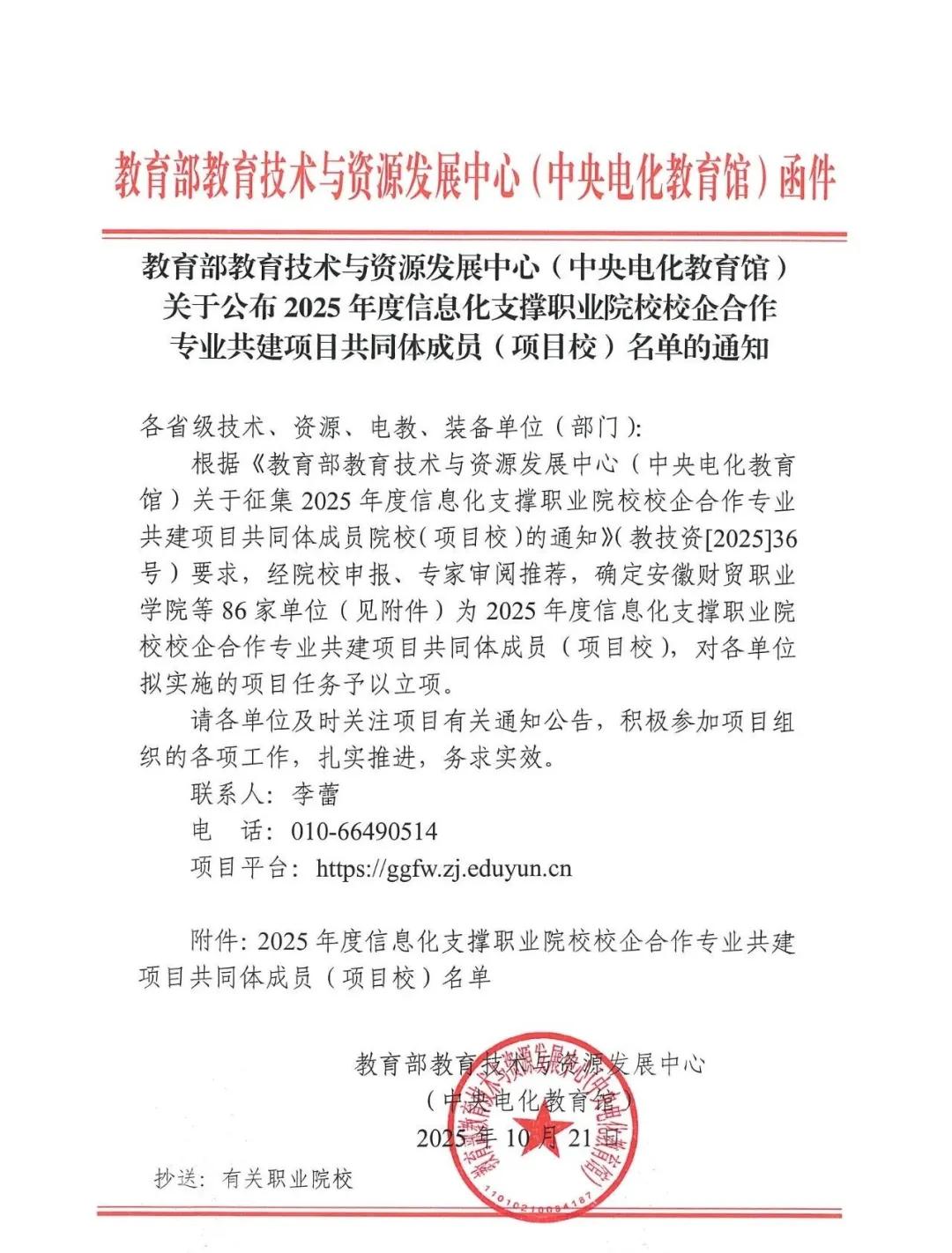 教育部教育技术与资源发展中心(中央电化教育馆)公布了2025年度信息化支撑职业院校校企合作专业共建项目共同体成员名单,学校物流管理学院申报的项目《物流类“三微”教学改革实践专项》经严格评审成功入选,成为全国86所获此资格的院校之一。