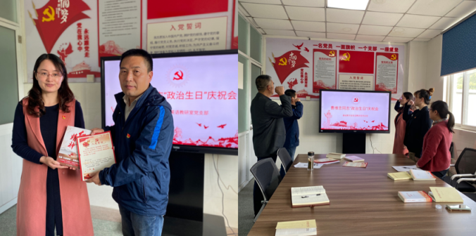 首先由杨凤琴同志为曹维忠同志颁发“生日”礼物--党员政治生日贺卡和红色书籍,支部全体党员在杨凤琴同志的带领下进行入党宣誓。
