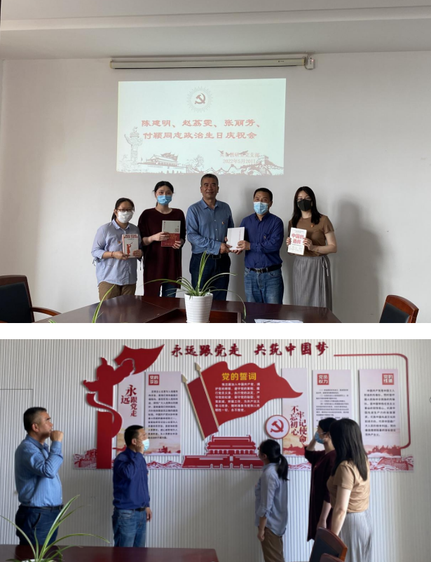 活动中,英语教研室党支部书记曹维忠同志向陈建明、赵荔雯、张丽芳、付颖四位党员送上红色书籍作为政治生日礼物,并带领全体党员重温了入党誓词,再次感悟入党时的初心和使命。四位党员也畅谈了当年入党的心路历程,表示在今后的工作和生活中,将时刻铭记入党初心,牢记党的宗旨使命,积极履行党员义务,坚定理想信念,时刻发挥共产党员的先锋模范作用。