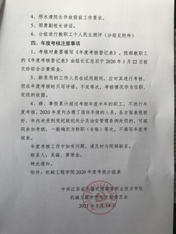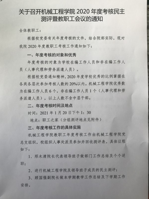 机械工程学院2020年度考核民主测评暨教职工会议通知