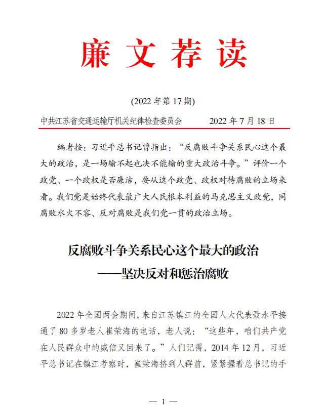 2022年廉文荐读第17期——反腐败斗争关系民心这个最大的政治