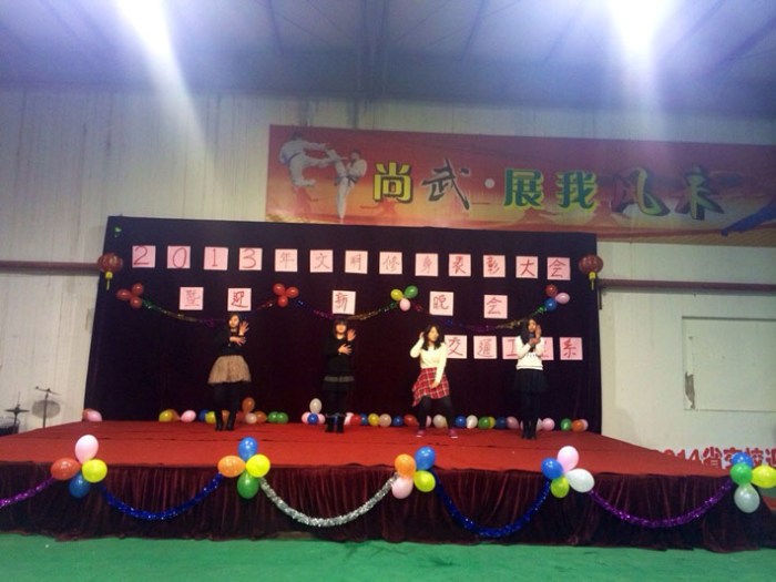 总结表彰大会结束后,伴随着深情动人的朗诵《中国梦》,迎新晚会拉开了序幕。小品《审贼》幽默搞笑,表演夸张,引得现场笑声不断;快舞让现场观众眼前一亮;吉他社表演新颖独特,现场气氛热烈。