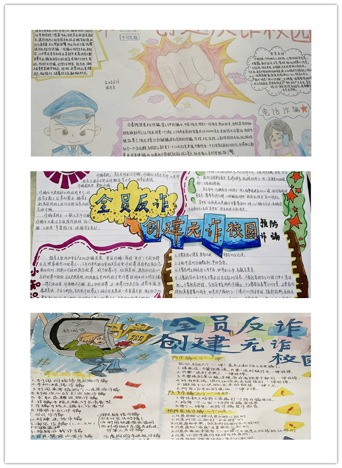 各个班级的同学们积极参与,图文并茂地宣传反诈骗知识,帮助同学们更好地预防和应对电信网络诈骗。本次活动让同学们了解了各种防诈骗手段及防诈骗知识,提高自身防范诈骗的意识和能力。通过手抄报的宣传,师生们普遍知晓了电信诈骗的形式、手段、特点和危害,并掌握了必要的防范技能。